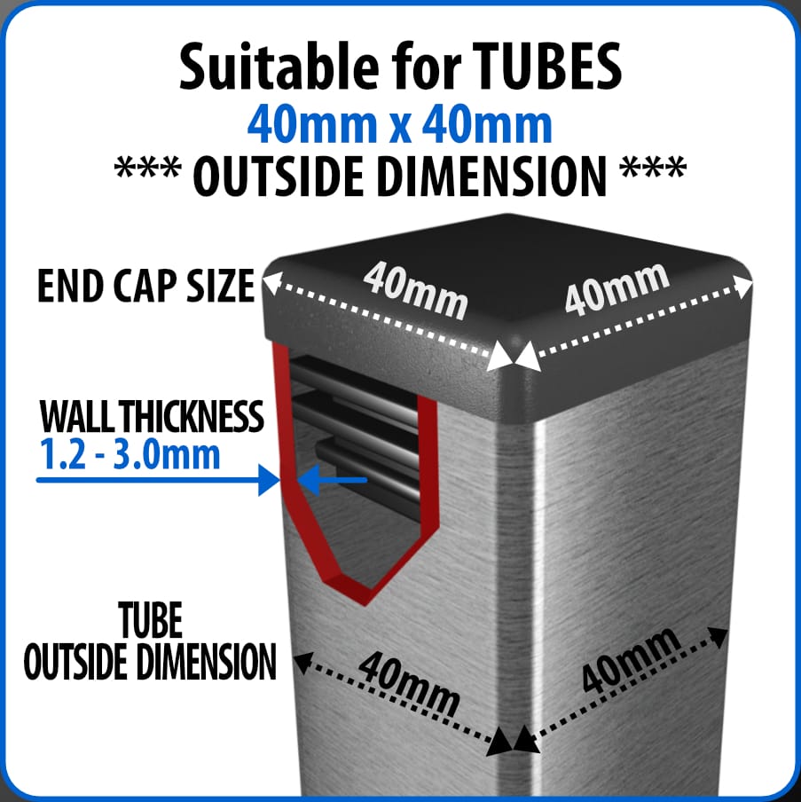 • Example: If you have a square tube that is 40mm by 40mm on the outside, you need a 40x40mm end cap. If you have a round tube with an outside diameter of 25mm, you need a 25mm end cap.